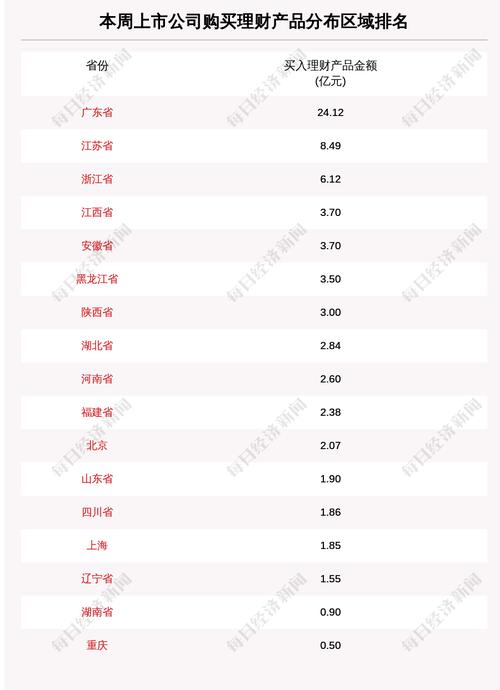 从上市公司所属地区上来看,本周买入理财产品金额排名前三的地区分别是广东省、江苏省、浙江省。