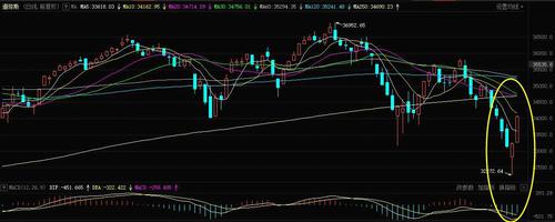 例如,美股道琼斯指数收盘大涨835点,涨幅2.51%,重回34000点上方。配合之前一天的“长针探底”式的K线形态和MACD形态,反弹并且出现底背离的机率比较大。说到底背离,特别注意一下:前一天实现惊天大逆转的纳斯达克指数几乎就要完成了。