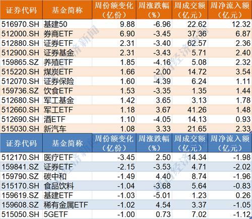 在行业主题ETF方面,本周份额增长超过1亿份的有12只基金,其中基建50、券商ETF、证券ETF(512880)和证券基金份额分别增加了9.88亿份、6.9亿份、2.31亿份和2.31亿份,分别净流入资金12.32亿元、6.87亿元、2.36和2.4亿元。