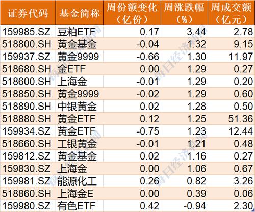商品ETF本周除有色ETF下跌0.94%外,其余均实现上涨,豆粕ETF大涨3.44%,而黄金相关ETF普遍涨逾1%。