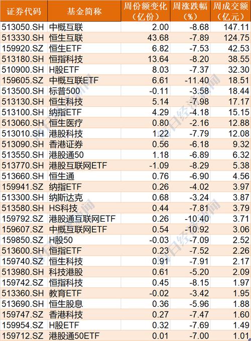 跨境ETF本周成交额超过1亿元的有30只,普遍出现调整,其中中概互联ETF、中概互联网ETF和港股通互联网ETF分别下跌了11.4%、10.92%和10.4%;份额上,恒生互联增加了43亿份。