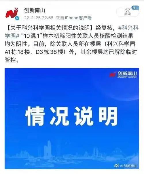 稍早之前,南山区发布通告称,科兴科学园有“10混1”初筛阳性关联人员需要排查。通告原文如下: