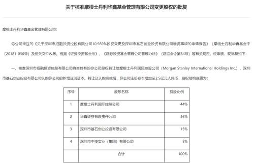 至此,摩根士丹利持股49%为第一大股东,华鑫证券持股36%,摩根士丹利受让深圳市中技实业(集团)有限公司持有大摩华鑫基金5%股权。本次中国证监会反馈意见所指股权变更事项即摩根士丹利受让华鑫证券转让的大摩华鑫基金36%股权。