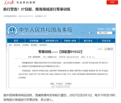 每经AI快讯,据中国海事局网站消息,清澜海事局发布航行警告,2月27日至3月1日,每天11时至15时,南海部分海域进行军事训练,禁止驶入。(人民日报)