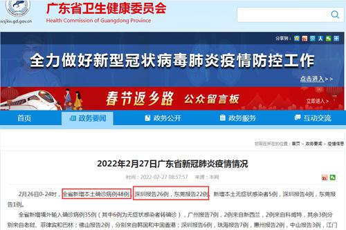 广东省卫健委网站2月27日通报,2月26日0—24时,广东省新增本土确诊病例48例,深圳报告26例,东莞报告22例。新增本土无症状感染者5例,深圳报告4例,东莞报告1例。