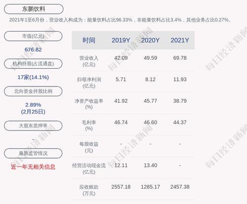 每经AI快讯,东鹏饮料(SH 605499,收盘价:169.2元)2月27日晚间发布年度业绩报告称,2021年营业收入约69.78亿元,同比增加40.72%;归属于上市公司股东的净利润盈利约11.93亿元,同比增加46.9%;基本每股收益盈利约3.11元,同比增加37.96%。分配方案为:不送红股、不转增。