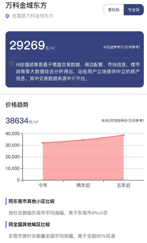 据每经AI品房小程序专业版测算,万科金域东方未来五年房价有望达到38634元/平方米同,预计会跑输东莞市平均涨幅,仅高于东莞市4%的小区,但会跑赢全国平均涨幅。