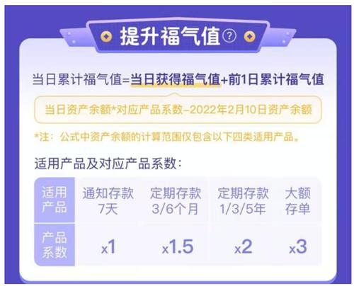 不过该规则同时表示,资产余额需较2022年2月10日新增≥1万元才能参与排名。另外,该行根据不同的存款产品,设置了对应的产品系数,而“福气值”是按照日均余额折算的(即:当日资产余额*对应产品系数-2022年2月10日当日资产余额)。