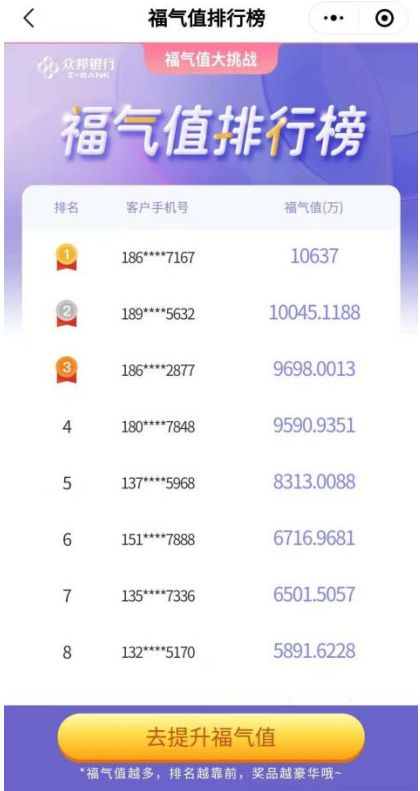 众邦银行活动规则显示,活动期间通过新增资产可积攒“福气值”,每日累计并进行排行,最后“福气值”累积排名前800的用户可100%获奖。根据排名情况,参与用户可获得iPhone手机、戴森吹风机、京东E卡等奖品。