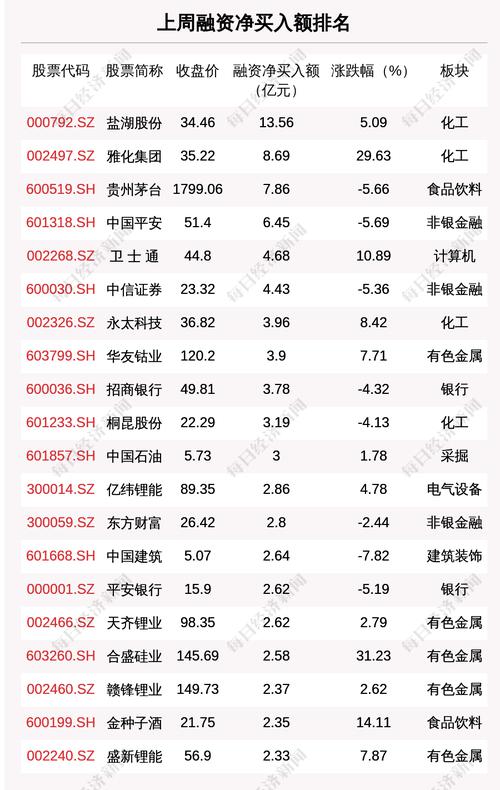 上周两市共有1036只个股有融资资金净买入,共有1只个股净买入金额超10亿元,其中盐湖股份、雅化集团、贵州茅台排名前三,买入金额分别为13.56亿元、8.69亿元、7.86亿元。