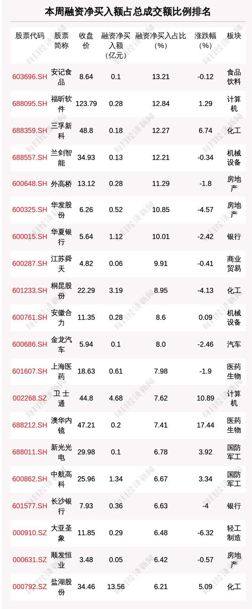 两市共有7只股票融资净买入额占总成交金额比例超10%,其中安记食品、福昕软件、三孚新科排名前三,占比分别为13.21%、12.84%、12.27%。