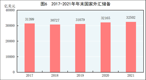 年末国家外汇储备32502亿美元,比上年末增加336亿美元。全年人民币平均汇率为1美元兑6.4515元人民币,比上年升值6.9%。