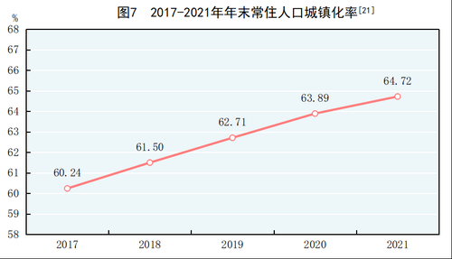 城乡区域协调发展扎实推进。年末全国常住人口城镇化率为64.72%,比上年末提高0.83个百分点。分区域看,全年东部地区生产总值592202亿元,比上年增长8.1%;中部地区生产总值250132亿元,增长8.7%;西部地区生产总值239710亿元,增长7.4%;东北地区生产总值55699亿元,增长6.1%。全年京津冀地区生产总值96356亿元,比上年增长7.3%;长江经济带地区生产总值530228亿元,增长8.7%;长江三角洲地区生产总值276054亿元,增长8.4%。粤港澳大湾区建设、黄河流域生态保护和高质量发展等区域重大战略深入实施。