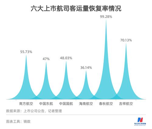 春秋航空的恢复率继续领跑,达到99.28%。排在其后的分别为吉祥航空(70.13%)、南方航空(55.73%)、中国国航(48.03%)、中国东航(47%)。