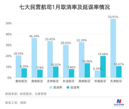 航班取消率方面,1月份天津航空的取消率最高,达到53.91%,这比去年12月增长了18个百分点。华夏航空的取消率最低,仅为6.34%。不过,华夏航空也有着七大民营航司中最高的延误率,达到19.68%。