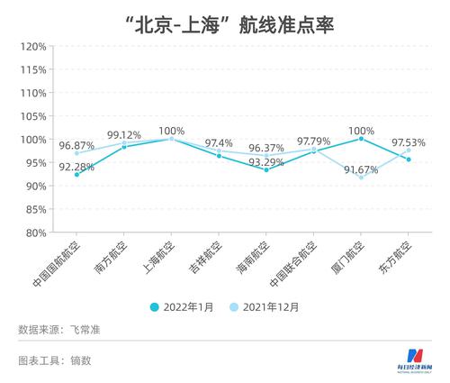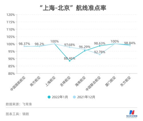 值得一提的是,在“上海-北京”这条热门航线上,吉祥航空1月份的准点率只有88.46%,环比下降9.22个百分点,在所有执飞航司中排名垫底。而在“北京-上海”航线上,国航的准点率最低,约92.28%。