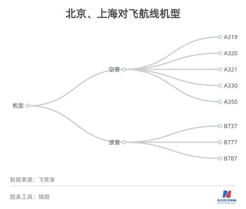 从机型来看,北京与上海的对飞航线上有8种机型在运行,其中空客机型5种(A319、A320、A321、A330、A350),波音机型3种(B737、B777、B787)。1月份,由空客飞机执飞的航班量大约是波音飞机的1.76倍。