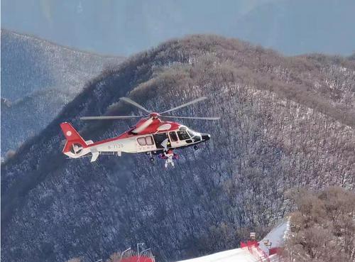 经过抢救治疗后,请示医疗官是否启动转运直升机转运,经过医疗官同意,我们将伤员抬送到转运直升机上,迅速转运到定点医院的冬奥专区。
