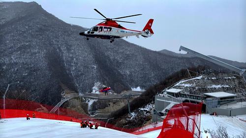 高山滑雪医疗救援中所用的直升机分为救援直升机和转运直升机两架。运动员发生伤情的区域一般都是高海拔区域,救援摩托车上不去,因此救援直升机用长绳将伤员吊运到停机坪医疗站,医疗队员会对其进行生命体征评估,还会进行诸如气道开放、输液和止痛等操作,这与其他医疗站是没区别的。
