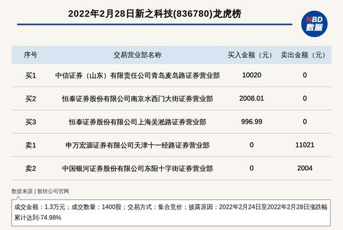 每经讯,2022年2月28日,新三板创新层公司新之科技(836780)登上龙虎榜,交易方式是集合竞价,披露原因是2022年2月24日至2022年2月28日涨跌幅累计达到-74.98%,成交数量1400股,成交金额1.3万元。买一席位为中信证券(山东)有限责任公司青岛麦岛路证券营业部,买入1万元;卖一席位为申万宏源证券有限公司天津十一经路证券营业部,卖出1.1万元。