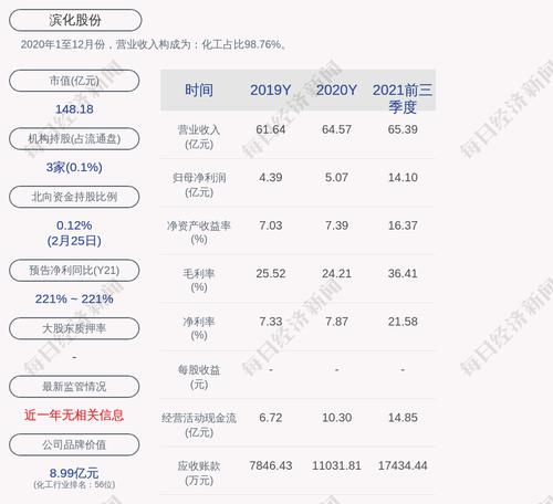 每经AI快讯,滨化股份(SH 601678,收盘价:7.2元)2月28日晚间发布2021年度业绩快报,营业收入约92.75亿元,同比增加43.63%;归属于上市公司股东的净利润盈利约16.26亿元,同比增加220.51%;基本每股收益盈利0.88元,同比增加166.67%。报告期内营业收入、营业利润、利润总额、归属于上市公司股东的净利润、归属于上市公司股东的扣除非经常性损益的净利润、基本每股收益较上年同期上涨幅度较大,主要原因为公司烧碱、环氧丙烷、三氯乙烯、四氯乙烯、氯丙烯、环氧氯丙烷产品市场价格上涨明显,产品毛利增加,导致公司效益大幅增加。