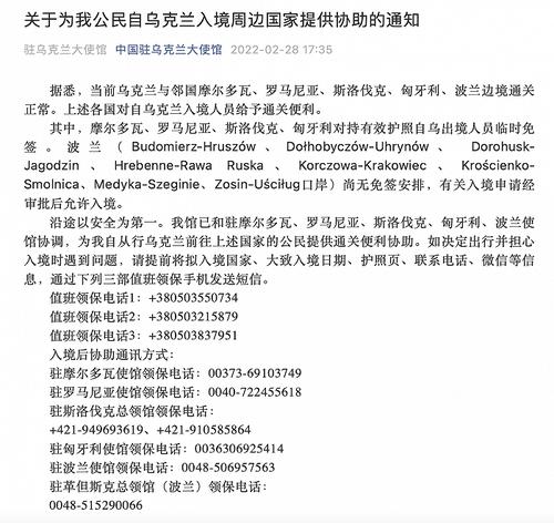 中国驻乌克兰大使馆2月28日发布关于为我公民自乌克兰入境周边国家提供协助的通知称,当前乌克兰与邻国摩尔多瓦、罗马尼亚、斯洛伐克、匈牙利、波兰边境通关正常。上述各国对自乌克兰入境人员给予通关便利。