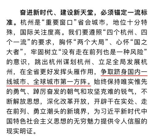 其中指出,要遵照“四个杭州、四个一流”的要求,胸怀“两个大局”、心怀“国之大者”,牢固树立“没有走在前列也是一种风险”的意识,跳出杭州谋划杭州、立足全局发展杭州,在全省更好发挥头雁作用,争取跻身国内一线城市、全球城市第一方阵。