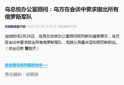 据央视新闻28日消息,当地时间2月28日下午,俄罗斯与乌克兰在白俄罗斯举行的第三轮谈判已经开始,预计将是最终轮。乌克兰总统办公室顾问表示,俄乌将于几分钟之后开始第三轮谈判。乌克兰总统办公室顾问阿列斯托维奇称,乌方在会谈中要求撤出所有俄罗斯军队,包括从克里米亚和顿巴斯撤出。