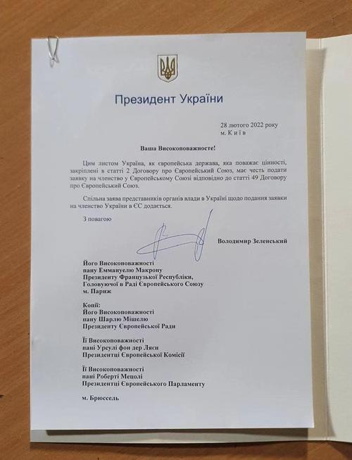 据央视新闻28日消息,当地时间2月28日,乌克兰总统泽连斯基签署加入欧盟的正式申请文件。