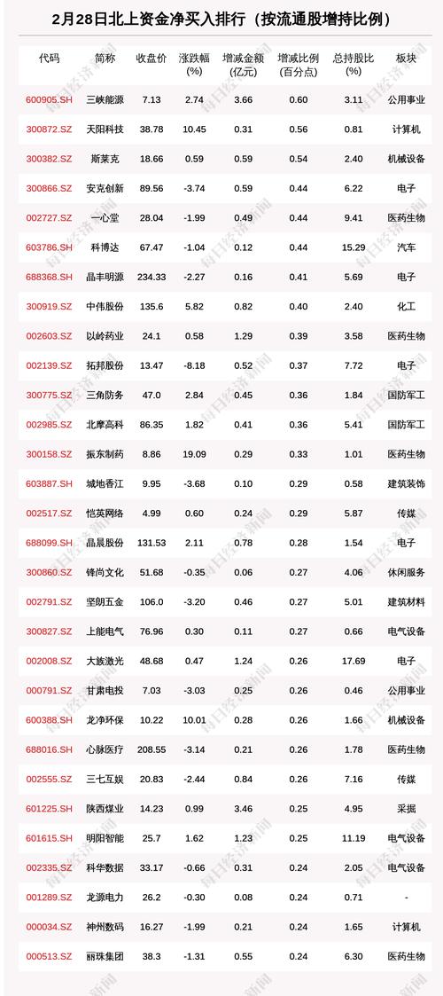 每经AI快讯,2月28日,北上资金净买入的个股共有679只,北上资金加仓比例超1%的有536只。其中,三峡能源(600905.SH,收盘价:7.13元)加仓比例最为明显,最新持股比例3.11%,环比增加0.60个百分点。其他北上资金加仓比例较多的个股还包括天阳科技(300872.SZ,收盘价:38.78元)、斯莱克(300382.SZ,收盘价:18.66元)、安克创新(300866.SZ,收盘价:89.56元)。