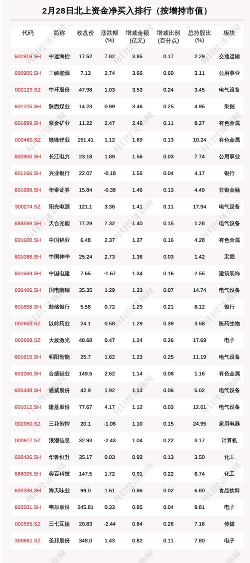 2月28日,按照北向资金增持市值排序,中远海控(601919.SH,收盘价:17.52元)增持市值最大,增持市值3.852亿元,环比增加8.83%。其他北上资金增持市值较多的个股还包括三峡能源(600905.SH,收盘价:7.13元)、中环股份(002129.SZ,收盘价:47.98元)、陕西煤业(601225.SH,收盘价:14.23元)。