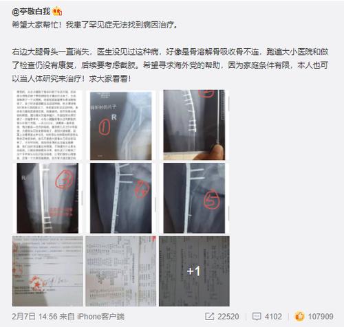 据城市晚报官方微博3月1日消息,23岁女孩薛彤(化名)16岁时右腿意外骨折后,出现骨吸收骨溶解情况,“4年前大腿植入的23厘米骨头已完全吸收”。患病后薛彤和父母跑遍多间知名医院,但至今尚未查清病因。有医生建议截肢,然而在下肢仍有知觉情况下,患者希望尽力保住腿。2月25日,薛彤来到广州中山大学附属第一医院,向骨肿瘤外科主任沈靖南教授求医。