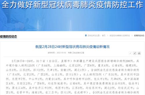 国家卫健委3月1日通报,2月28日0—24时,31个省(自治区、直辖市)和新疆生产建设兵团报告新增确诊病例200例。其中,本土病例75例(广东31例,其中深圳市23例、东莞市7例、中山市1例;内蒙古14例,其中呼和浩特市13例、包头市1例;天津6例,其中滨海新区4例、东丽区2例;广西6例,均在防城港市;云南6例,其中德宏傣族景颇族自治州5例、临沧市1例;黑龙江4例,其中牡丹江市3例、鸡西市1例;江苏3例,均在苏州市;湖北2例,均在武汉市;山西1例,在晋中市;海南1例,在三亚市;四川1例),含3例由无症状感染者转为确诊病例(天津2例,黑龙江1例)。无新增死亡病例。