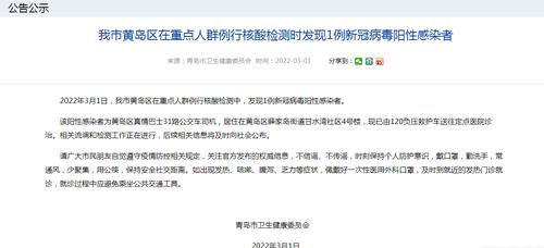 据青岛市卫生健康委员会网站,2022年3月1日,我市黄岛区在重点人群例行核酸检测中,发现1例新冠病毒阳性感染者。