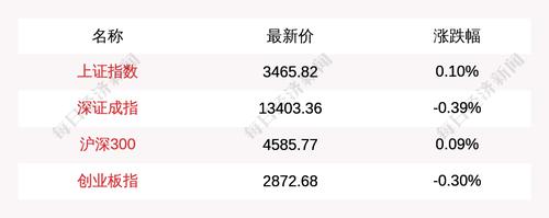 截至北京时间13:30,上证指数报3465.82点,涨0.10%,深证成指报13403.36点,跌0.39%,沪深300报4585.77点,涨0.09%,创业板指报2872.68点,跌0.30%