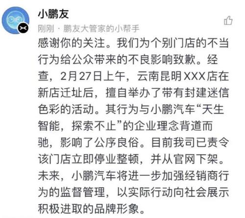 对此,小鹏汽车官方在其社区给出回应称,为个别门店不当行为给公众带来的不良影响致歉。2月27日上午,云南昆明某店在新店迁址后,擅自举办了带有封建迷信色彩的活动,其行为与小鹏汽车“天生智能,探索不止”的企业理念背道而驰,影响了公序良俗。