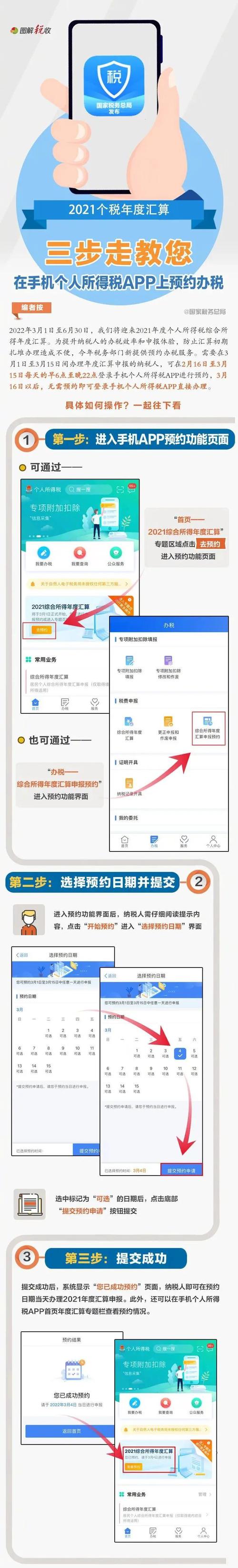 纳税人如需在3月1日至3月15日之间办理年度汇算,可在2月16日至3月15日每天的早6点至晚22点登录手机个人所得税APP进行预约。