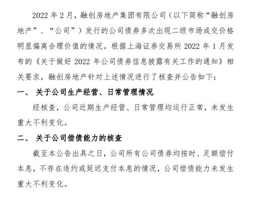 每经AI快讯,融创房地产:经核查,公司近期生产经营、日常管理均运行正常,未发生重大不利变化。截至本公告出具之日,公司所有公司债券均按时、足额偿付本息,不存在违约或延迟支付本息的情况,公司偿债能力未发生重大不利变化。
