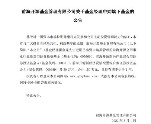 每经AI快讯,3月1日,前海开源基金发布公告称,该公司基金经理崔宸龙近期已出资申购其管理的前海开源公用事业股票、前海开源新兴产业混合、前海开源新经济混合各50万元,合计150万元,且持有期不少于1年。对于自购的原因,崔宸龙表示,一方面是考虑到基金打开了限购,另一方面的主要因素是考虑近期新能源板块回调较多,但行业基本面情况优异,短期市场走势与板块基本面背离较大,因此当前或是较好的中长期布局机遇。(证券时报·e公司)