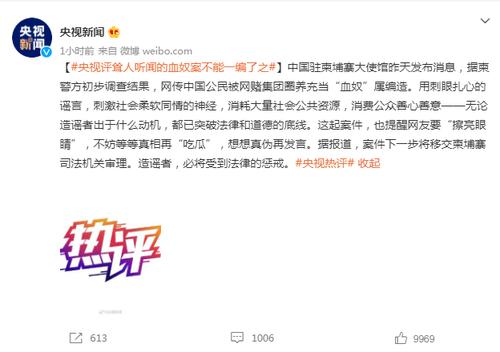 中国驻柬埔寨大使馆2月28日晚间发布消息称,我馆对网传“血奴”案高度关注,在敦促柬埔寨警方于2月15日立案后,持续跟进案件进展。2月28日,柬警方向我馆通报了初步调查结果并发布公告,认定所谓“血奴”案纯属编造。