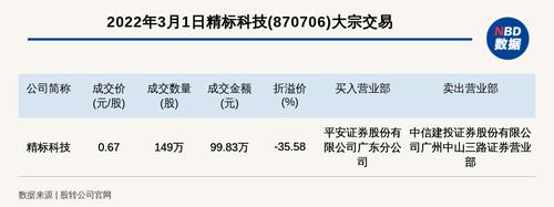 每经讯,2022年3月1日,新三板创新层公司精标科技(870706)发生一笔大宗交易,成交价0.67元/股,成交数量149万股,成交金额99.83万元,折价35.58%。买入营业部是平安证券股份有限公司广东分公司,卖出营业部是中信建投证券股份有限公司广州中山三路证券营业部。