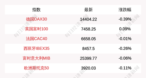 每经AI快讯:北京时间3月1日16:00,德国DAX30指数开盘下跌56.8点,跌幅为0.39%,报14404.22点;英国富时100指数开盘上涨6.8点,涨幅为0.09%,报7465.05点;法国CAC40指数开盘下跌0.78点,跌幅为0.01%,报6658.05点;西班牙IBEX35指数开盘下跌21.7点,跌幅为0.26%,报8457.5点;富时意大利MIB指数开盘下跌16.12点,跌幅为0.06%,报25399.77点;欧洲斯托克50指数开盘下跌4.2点,跌幅为0.11%,报3920.03点。