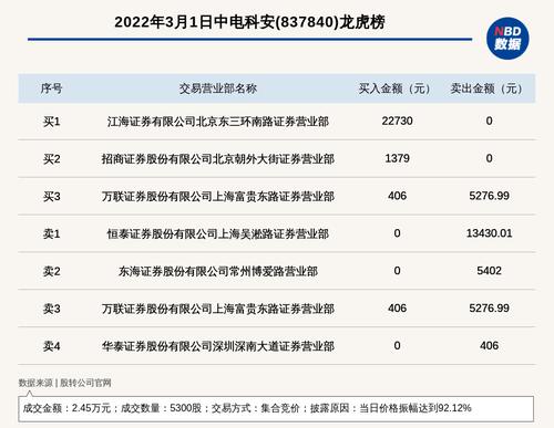 每经讯,2022年3月1日,新三板创新层公司中电科安(837840)登上龙虎榜,交易方式是集合竞价,披露原因是当日价格振幅达到92.12%,成交数量5300股,成交金额2.45万元。买一席位为江海证券有限公司北京东三环南路证券营业部,买入2.27万元;卖一席位为恒泰证券股份有限公司上海吴淞路证券营业部,卖出1.34万元。