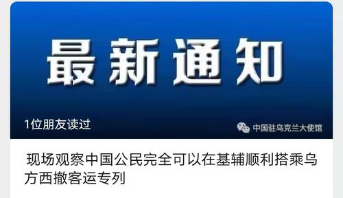 据中国驻乌克兰大使馆微信号消息,3月1日,乌方开通专门用于撤离的专列,我馆已在第一时间发布有关信息。