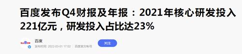 据百度官方账号消息,北京时间3月1日,百度发布了截至2021年12月31日的第四季度及全年未经审计的财务报告。