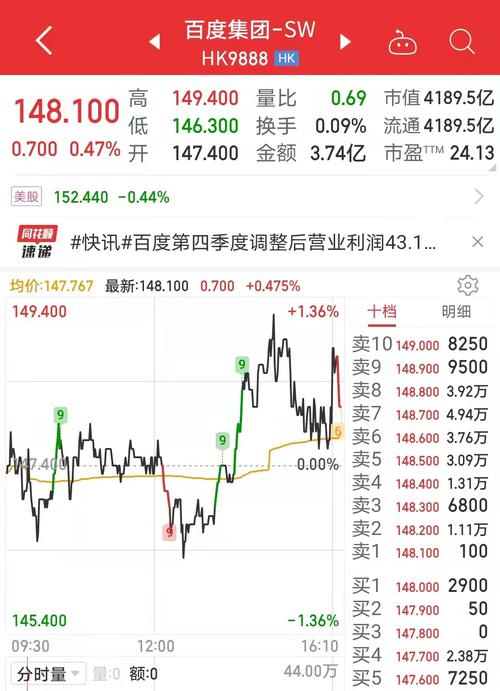 3月1日,百度港股收报148.1港元,涨0.47%,目前总市值为4189.5亿港元。