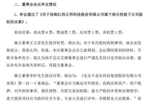 值得注意的是,针对这份收购议案, 大北农董事会中有两位独立董事以相关材料不齐全、不充分为由,分别投出了反对票、弃权票。 投出反对票的独立董事李轩称:“公司管理层甚至没有准确说明标的公司的净资产、交易具体价格,相关股权转让协议草拟稿存在重大瑕疵,难以有效防范收购过程中及收购后的重大法律风险。”