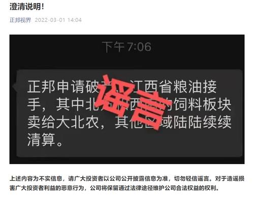 3月1日 上午,市场上流传出一份关于“正邦申请破产,江西省粮油接手”的传闻。