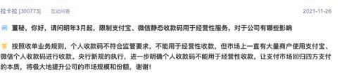 在上述文件发布后,支付机构拉卡拉曾在深交所“互动易”平台答复投资者:“央行新规的执行,进一步明确个人收款码不能用于经营性收款,让支付市场回归四方支付的本质,将极大地提升公司的市场规模和份额。”2021年11月26日,拉卡拉股价应声大涨18.02%。