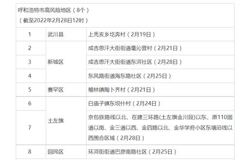 据呼和浩特新闻网微信号3月1日消息,自2022年2月28日12时起,将新城区成吉思汗大街街道东河社区调整为高风险地区;